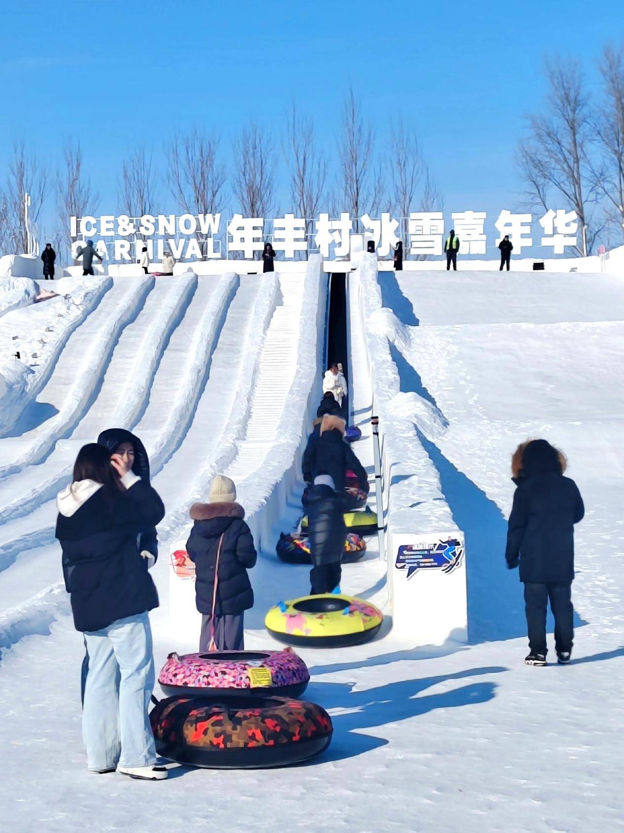 在年丰村冰雪嘉年华的核心区域,雪地摩托的轰鸣与游客的欢笑交织成动感乐章。四条形态各异的雪滑梯前排起长队,弯曲滑道上的雪圈在雪壁间“滞空”旋转,孩子们冻红的小手紧紧抓着扶手,笑声穿透林海。
