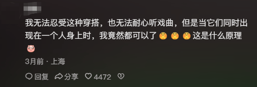 “我无法忍受这总穿搭,也无法耐心听戏曲,但是当它们同时出现在一个人身上时,我竟然都可以了。“