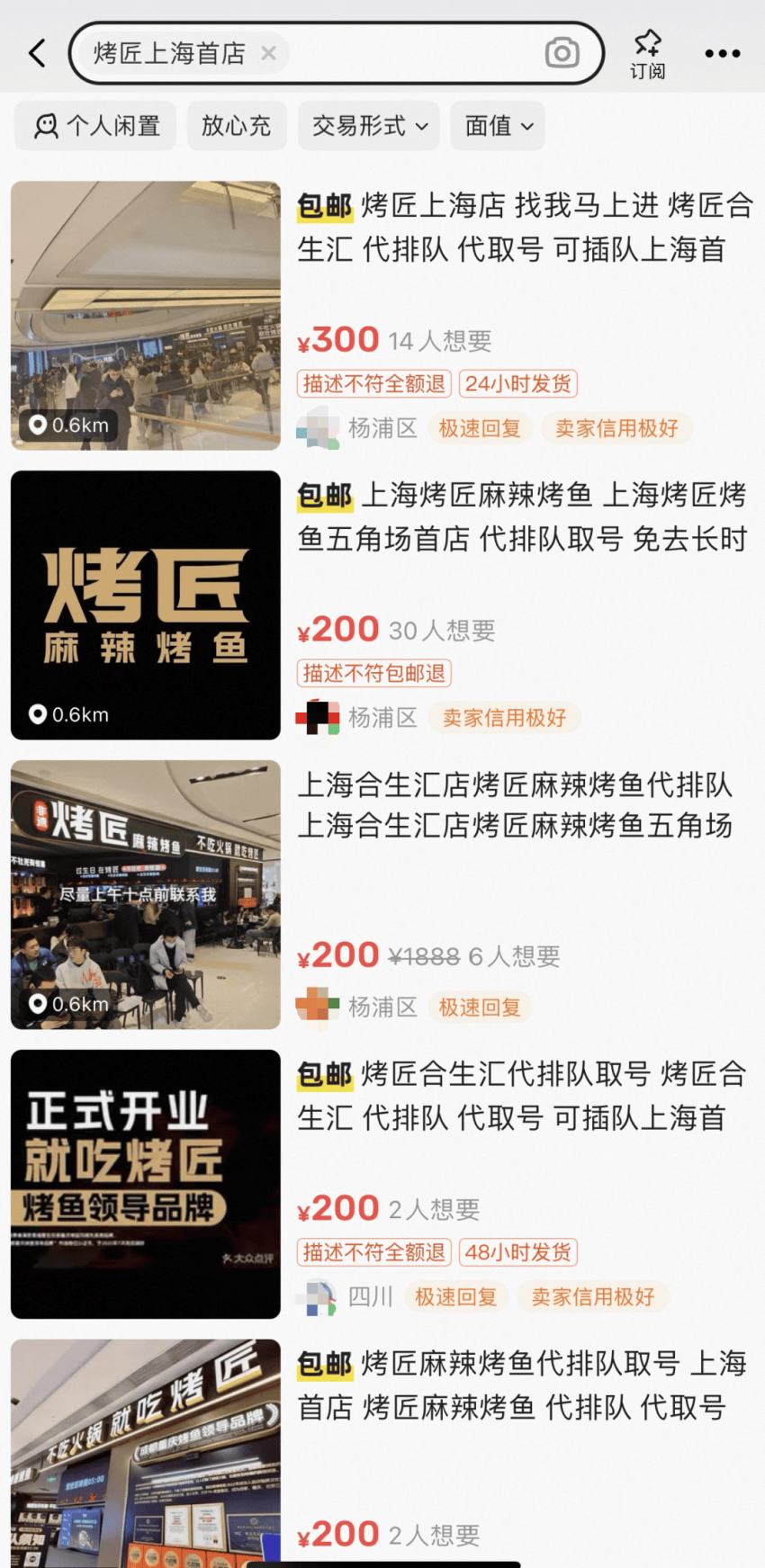 烤匠2024年进入北京市场,因火爆排队一度吸引全北京的黄牛放弃SKP,盘旋在新的流量地,黄牛号一度炒至最高300元,而今年陆续开出的西安首店黄牛号则叫价100-160元不等、上海首店黄牛号叫价最高至300元,都超出一条了麻辣烤鱼的售价。